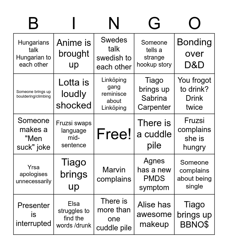 This bingo card has a free space and 30 words: Elsa struggles to find the words /drunk, Only 1 person laughs at a joke, Fruzsi swaps language mid-sentence, Germans talk german to each other, Hungarians talk Hungarian to each other, Swedes talk swedish to each other, Lotta is loudly shocked, Marvin complains, There is a cuddle pile, There is more than one cuddle pile, Fruzsi complains she is hungry, Tiago brings up BBNO$, Alise has awesome makeup, Felicia, Tiago, Ellen& Fruzsi make 10 innapropriate jokes, You frogot to drink? Drink twice, Jana says "oooo nice >:)", Agnes has a new PMDS symptom, Yrsa apologises unnecessarily, Tiago brings up, Bonding over D&D, Someone makes a "Men suck" joke, Someone triggers a rant from Fruzsi, Anime is brought up, Tiago brings up Sabrina Carpenter, Someone brings up bouldering/climbing, Someone tells a strange hookup story, Someone complains about being single, Presenter is interrupted, Linköping gang reminisce about Linköping and More than three people are late.