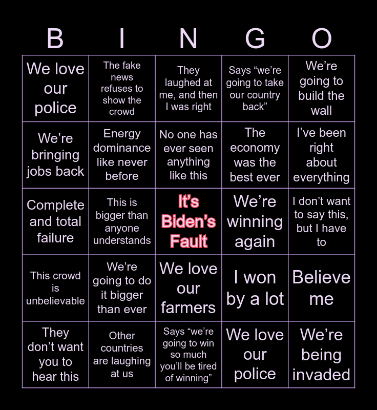 This bingo card has a free space and 151 words: A lot of people don’t know this, We’re looking very strongly at that, Everybody knows it, The fake news won’t tell you, I’ve been treated very unfairly, Many, many people are saying, We did things nobody thought possible, Record‑breaking numbers, The likes of which you’ve never seen, Other countries are laughing at us, The border is a disaster, We had the safest border in history, The economy was the best ever, We’re going to fix it on day one, Energy dominance like never before, We’re bringing jobs back, The military loves me, We’re going to take care of our great veterans, China is taking advantage of us, We’re going to cut regulations like nobody’s ever seen, I’m the only one who can do it, Nobody knows more about this than I do, People tell me I’m the best at it, We had the biggest crowd, Historic victory, Tremendous success, Incredible people, the best people, We’re winning again, Sudden shift to a personal anecdote, Complains about media coverage, Mentions a poll without naming the source, Brings up an unrelated grievance, Talks about a celebrity unexpectedly, Says “by the way” and changes topic entirely, Repeats a phrase three times in a row, Mispronounces a name or place, Tells a story with unclear timeline, Claims something happened “just the other day”, We’re being invaded, They’re coming from prisons, We don’t know who they are, Other countries are sending their worst, We’re going to build the wall, The wall worked better than anyone expected, The stock market was the highest ever, We created more jobs than any administration, Factories are coming back, We’re cutting taxes like never before, This crowd is unbelievable, You won’t hear this anywhere else, They’re trying to silence you, We love our police, We love our farmers, We love our truckers, Random nickname for an opponent, Claims credit for something unrelated, Says “believe me” after a questionable claim, Uses “tremendous” twice in one sentence, Says “I don’t want to say this, but…”, Mentions a lawsuit, Says “I probably shouldn’t say this”, Says “I’ve been right about everything”, We’re going to do it bigger than ever, Says “nobody’s ever seen anything like it”, Says “people are saying…”, Says “it’s true, you know it, everybody knows it”, Says “we’re going to take our country back”, Says “we’re going to make America greater than ever before”, Says “they don’t want you to know this”, Says “I’ve done more than any president”, Says “we’re going to win so much you’ll be tired of winning”, I won by a lot, Everyone knows it was rigged, The system is totally corrupt, They’re coming after me because I’m fighting for you, Witch hunt, Greatest witch hunt in history, The most persecuted person in American history, I’ve done more than any president, No one has ever seen anything like this, People are calling me and thanking me, They’re very fine people, We had the biggest numbers ever, The crowd was bigger than anyone reports, The fake news refuses to show the crowd, The media is the enemy of the people, They don’t want you to hear this, They’re trying to silence you, If they can do it to me, they can do it to you, We’re going to take our country back, We’re going to save our country, We’re going to make America greater than ever before, We’re a failing nation, We’re becoming a third‑world country, Other countries are laughing at us, We’re being invaded at the border, They’re emptying their prisons into our country, We don’t know who they are, where they’re from, They’re destroying our country, We had the strongest border in history, We built hundreds of miles of wall, The wall was working better than anyone expected, We had the greatest economy in the history of the world, Best jobs numbers ever, The stock market was at record highs, Everybody was winning, Then they came in and destroyed it, They don’t care about you, They only care about power, The radical left, The globalists, The deep state, The corrupt establishment, The most corrupt administration in history, Total disaster, Complete and total failure, They’re weaponizing the justice system, I have the best lawyers, We’re going to fight it, and we’re going to win, I’ve been right about everything, They laughed at me, and then I was right, I said it would happen, and it happened, I probably shouldn’t say this, but…, I’m not supposed to say this, but…, Some people won’t like this, They’re not going to like that I’m saying this, I don’t want to say this, but I have to, Believe me, Tremendous, Tremendously tremendous, We love our police, We love our farmers, We love our truckers, We love our great, great patriots, You won’t hear this anywhere else, This is bigger than anyone understands, Stronger than anyone has ever seen, We’re going to do it bigger than ever before, We’re going to win so much you’ll be tired of winning, They said it couldn’t be done, Nobody thought we could do it, Nobody knows more about this than I do, I know more about it than the generals, I know more about it than the experts, We had peace through strength, Other countries respected us, Now they don’t respect us anymore, They’re making us look weak, We’re going to restore law and order, We’re going to clean up this mess and Day one, we’re going to fix it.