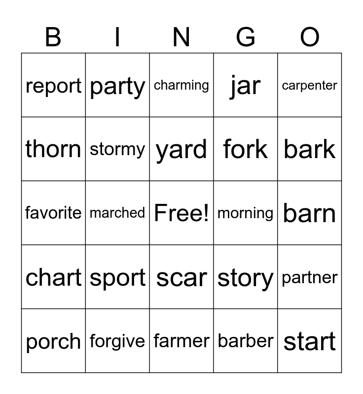 This bingo card has a free space and 24 words: sport, forgive, yard, porch, carpenter, report, thorn, party, morning, scar, fork, favorite, story, partner, stormy, barber, barn, charming, bark, marched, start, chart, jar and farmer.