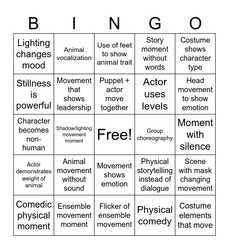 This bingo card has a free space and 24 words: Animal movement without sound, Ensemble movement moment, Puppet + actor move together, Comedic physical moment, Costume shows character type, Lighting changes mood, Stillness is powerful, Animal vocalization, Group choreography, Movement shows emotion, Actor uses levels, Character becomes non-human, Physical storytelling instead of dialogue, Scene with mask changing movement, Movement that shows leadership, Physical comedy, Moment with silence, Use of feet to show animal trait, Head movement to show emotion, Shadow/lighting movement moment, Costume elements that move, Actor demonstrates weight of animal, Story moment without words and Flicker of ensemble movement.
