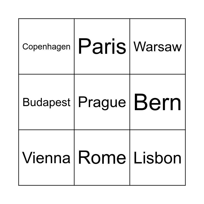 This bingo card has a free space and 8 words: Bern, Warsaw, Paris, Vienna, Copenhagen, Lisbon, Budapest and Rome.