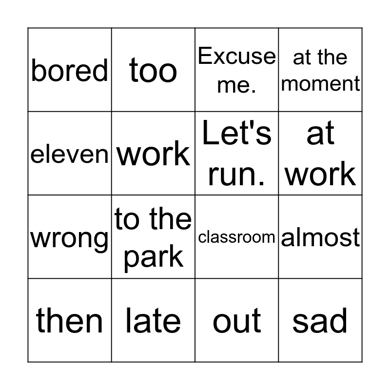 This bingo card has 31 words: time, clock, almost, scared, bored, Excuse me., Let's run., dark, late, go, out, then, great, play battleships, to the park, take a bus, o'clock, tired, sad, upset, eleven, twelve, look at, too, wrong, work, at the moment, classroom, our, at work and at home.
