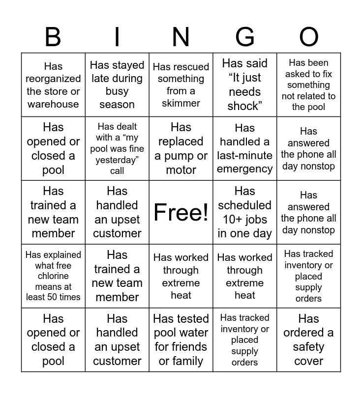This bingo card has a free space and 48 words: Has worked during peak summer rush, Has handled an upset customer, Has replaced a pump or motor, Has upsold a customer successfully, Has answered the phone all day nonstop, Has explained what pH means at least 50 times, Has stayed late during busy season, Has loaded heavy bags of salt or sand, Has scheduled 10+ jobs in one day, Has driven a fully stocked service truck, Has opened or closed a pool, Has dealt with a “my pool was fine yesterday” call, Has helped a customer choose chemicals, Has tracked inventory or placed supply orders, Has worked a Saturday in season, Has solved a billing or invoice issue, Has rescued something from a skimmer, Has worked through extreme heat, Has handled a last-minute emergency, Has reorganized the store or warehouse, Has trained a new team member, Has tested pool water for friends or family, Has said “It just needs shock”, Has been asked to fix something not related to the pool, Has worked during peak summer rush, Has handled an upset customer, Has replaced a pump or motor, Has upsold a customer successfully, Has answered the phone all day nonstop, Has explained what free chlorine means at least 50 times, Has taken a CPO class, Has loaded heavy bags of salt or sand, Has scheduled 10+ jobs in one day, Has driven a fully stocked service truck, Has opened or closed a pool, Has dealt with a “my pool was fine yesterday” call, Has helped a customer choose chemicals, Has tracked inventory or placed supply orders, Has ordered a safety cover, Has solved a billing or invoice issue, Has rescued something from a skimmer, Has worked through extreme heat, Has handled a last-minute emergency, Has reorganized the store or warehouse, Has trained a new team member, Has tested pool water for friends or family, Has said “It just needs shock” and Has been asked to fix something not related to the pool.