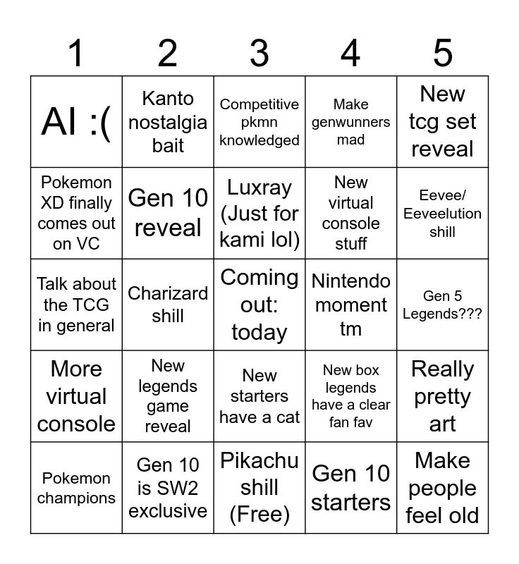 This bingo card has 25 words: More virtual console, Gen 10 is SW2 exclusive, Coming out: today, Gen 10 starters, New tcg set reveal, AI :(, Kanto nostalgia bait, Competitive pkmn knowledged, Nintendo moment tm, Really pretty art, Pokemon XD finally comes out on VC, Gen 10 reveal, Pikachu shill (Free), New box legends have a clear fan fav, Eevee/ Eeveelution shill, Pokemon champions, Charizard shill, Luxray (Just for kami lol), New virtual console stuff, Gen 5 Legends???, Talk about the TCG in general, New legends game reveal, New starters have a cat, Make genwunners mad and Make people feel old.