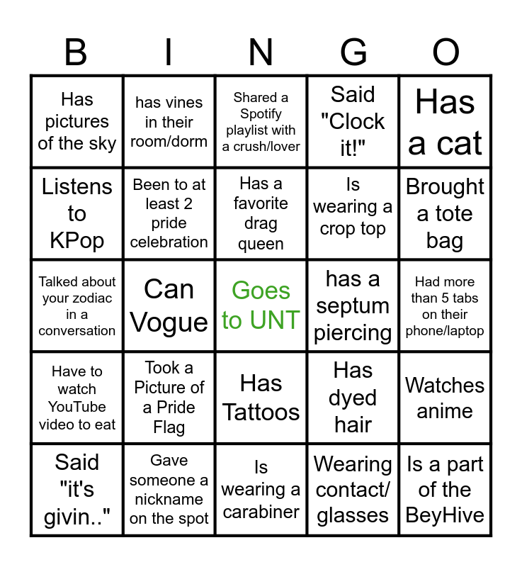 This bingo card has a free space and 24 words: Took a Picture of a Pride Flag, Gave someone a nickname on the spot, Has a favorite drag queen, Said "it's givin..", Has a cat, Has pictures of the sky, Listens to KPop, has vines in their room/dorm, has a septum piercing, Has Tattoos, Is wearing a crop top, Talked about your zodiac in a conversation, Has dyed hair, Watches anime, Been to at least 2 pride celebration, Wearing contact/ glasses, Had more than 5 tabs on their phone/laptop, Shared a Spotify playlist with a crush/lover, Brought a tote bag, Can Vogue, Is a part of the BeyHive, Have to watch YouTube video to eat, Said "Clock it!" and Is wearing a carabiner.