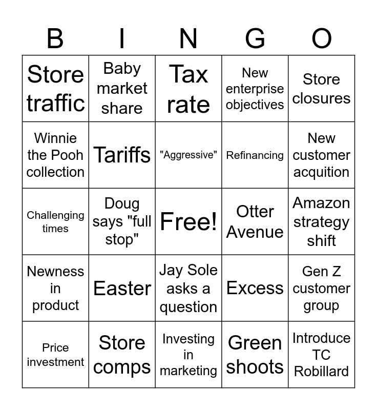 This bingo card has a free space and 33 words: Inventory position, FX rates, Doug says "full stop", Team refuses to answer analyst question, Newness in product, Tariffs, Store closures, Price investment, Baby market share, Return to growth, "Aggressive", Tax rate, Country of origin, "Privilege" to serve young families, Otter Avenue, New customer acquition, Store comps, Challenging times, Easter, Excess, Jay Sole asks a question, Basket starters, Store traffic, Amazon strategy shift, Investing in marketing, Introduce TC Robillard, New enterprise objectives, Refinancing, Winnie the Pooh collection, Gen Z customer group, Embrace the wonder of childhood, Green shoots and Legacy brands.