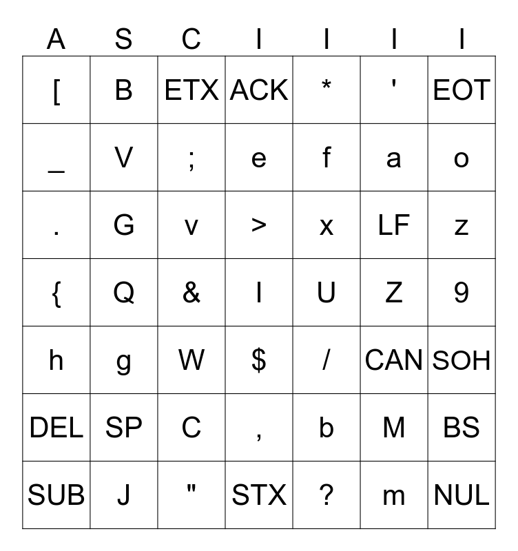 This bingo card has 128 words: A, B, C, D, E, F, G, H, I, J, K, L, M, N, O, P, Q, R, S, T, U, V, W, X, Y, Z, a, b, c, d, e, f, g, h, i, j, k, l, m, n, o, p, q, r, s, t, u, v, w, x, y, z, 1, 2, 3, 4, 5, 6, 7, 8, 9, 0, `, -, =, [, ], \, ;, ', ,, ., /, ~, !, @, #, $, %, ^, &, *, (, ), _, +, {, }, |, :, ", <, >, ?, NUL, SOH, STX, ETX, EOT, ENQ, ACK, BEL, BS, HT, LF, VT, FF, CR, SO, SI, DLE, DC1, DC2, DC3, DC4, NAK, SYN, ETB, CAN, EM, SUB, ESC, FS, GS, RS, US, SP and DEL.