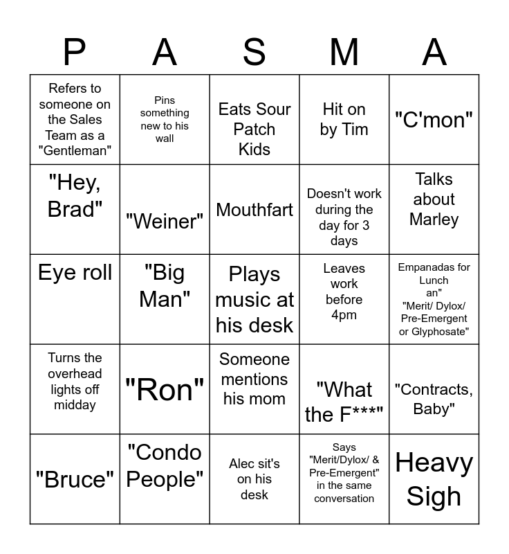 This bingo card has a free space and 24 words: "Bruce", "Ron", Mouthfart, Says "Merit/Dylox/ & Pre-Emergent" in the same conversation, "C'mon", Refers to someone on the Sales Team as a "Gentleman", Pins something new to his wall, Eats Sour Patch Kids, Leaves work before 4pm, Empanadas for Lunch an" "Merit/ Dylox/ Pre-Emergent or Glyphosate", Eye roll, "Weiner", "What the F***", "Contracts, Baby", "Hey, Brad", "Condo People", Alec sit's on his desk, Hit on by Tim, Talks about Marley, Turns the overhead lights off midday, "Big Man", Someone mentions his mom, Doesn't work during the day for 3 days and Heavy Sigh.