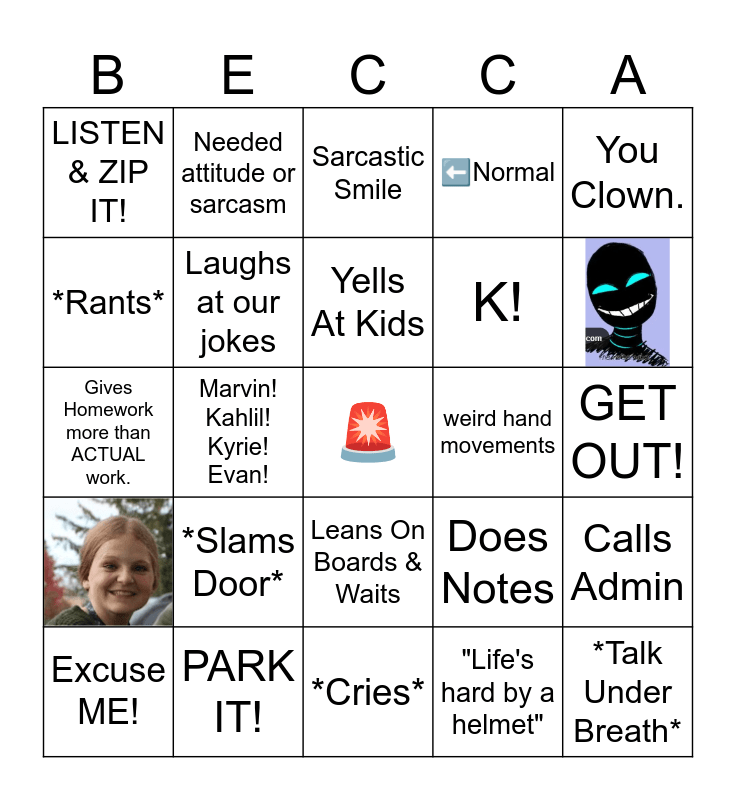 This bingo card has 2 images, a free space and 22 words: *Slams Door*, PARK IT!, Yells At Kids, Excuse ME!, You Clown., LISTEN & ZIP IT!, *Rants*, Needed attitude or sarcasm, weird hand movements, Leans On Boards & Waits, K!, Gives Homework more than ACTUAL work., Does Notes, Calls Admin, Laughs at our jokes, "Life's hard by a helmet", GET OUT!, Sarcastic Smile, Marvin! Kahlil! Kyrie! Evan!, *Talk Under Breath*, ⬅️Normal and *Cries*.