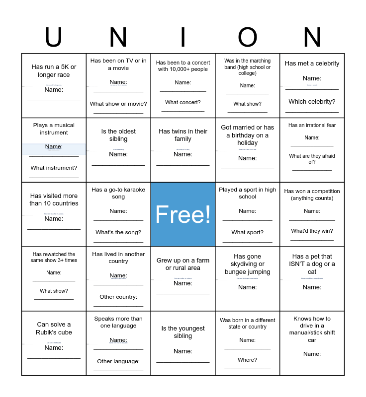 This bingo card has 14 images, a free space and 24 words: Has lived in another country Name: _______________ Other country: _______________, Speaks more than one language Name: _______________ Other language: _______________, Has twins in their family Name: _______________, Can solve a Rubik's cube Name: _______________, Has met a celebrity Name: _______________ Which celebrity? _______________, Has run a 5K or longer race Name: _______________, Plays a musical instrument Name: _______________ What instrument? _______________, Has been on TV or in a movie Name: _______________ What show or movie? _______________, Played a sport in high school Name: _______________ What sport? _______________, Grew up on a farm or rural area Name: _______________, Got married or has a birthday on a holiday Name: _______________, Has visited more than 10 countries Name: _______________, Has gone skydiving or bungee jumping Name: _______________, Has a pet that ISN'T a dog or a cat Name: _______________, Is the oldest sibling Name: _______________, Was born in a different state or country Name: _______________ Where? _______________, Has won a competition (anything counts) Name: _______________ What'd they win? ______________, Has been to a concert with 10,000+ people Name: _______________ What concert? ______________, Has an irrational fear Name: _______________ What are they afraid of? ______________, Has a go-to karaoke song Name: _______________ What's the song? _______________, Knows how to drive in a manual/stick shift car Name: _______________, Has rewatched the same show 3+ times Name: _______________ What show? ______________, Was in the marching band (high school or college) Name: _______________ What show? ______________ and Is the youngest sibling Name: _______________.
