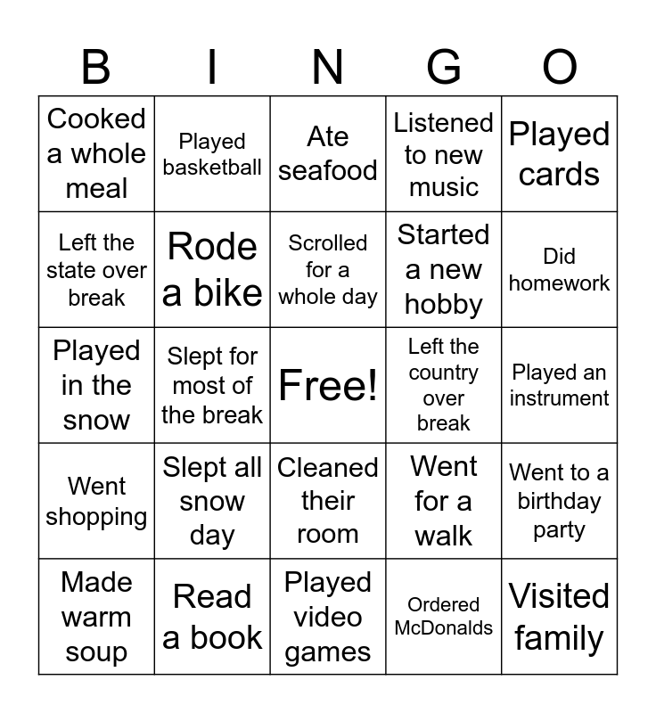 This bingo card has a free space and 24 words: Slept all snow day, Read a book, Scrolled for a whole day, Made warm soup, Played cards, Cooked a whole meal, Left the state over break, Played basketball, Left the country over break, Cleaned their room, Started a new hobby, Played in the snow, Went for a walk, Went to a birthday party, Rode a bike, Ordered McDonalds, Played an instrument, Ate seafood, Did homework, Slept for most of the break, Visited family, Went shopping, Listened to new music and Played video games.