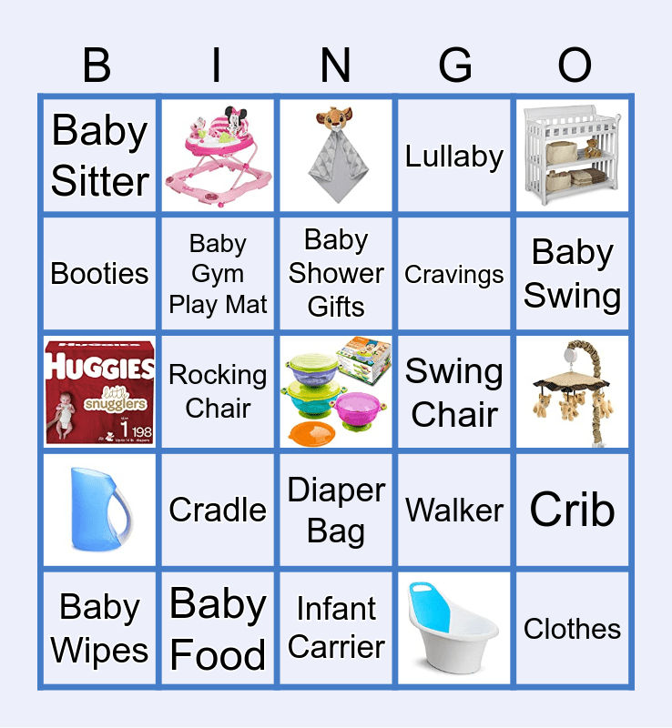This bingo card has 29 images and 66 words: Registry, Baby Shower Favors, Baby Bottle, Baby Buggy, Baby Carrier, Baby Clothes, Baby Food, Bath-Time, Baby Shoes, Baby #2, Baby Signora, Baby Shower Gifts, Baby Sitter, Baby Swing, Baby Toy, Bassinet, Baby Wear, Baby Girl, Basket, Bottle, Mobile, Lullaby, Booties, Bouncer Seat, Cravings, Cloth Diaper, Cradle, Blanket, Nighttime Feeding, Ultrasound, Baby Wipes, Infant Carrier, Pacifier, Stroller, Crib, Rocking Chair, Diaper Bag, Walker, Swing Chair, Bouncer, Bedding, Play Pen, Dresser, Monitor, Clothes, Toys, Favorite Book, FaceTime, Baby shower, Bibs, Tights, Thermometer, Baby Gym Play Mat, Family Tree, Placemats, Baby Wipes, Spoons, Bowls, April 13th Due Date, Christine, Jeff, Baby Books, Nursery Rhymes, Nursery, Baby photos and Big brother Ben.