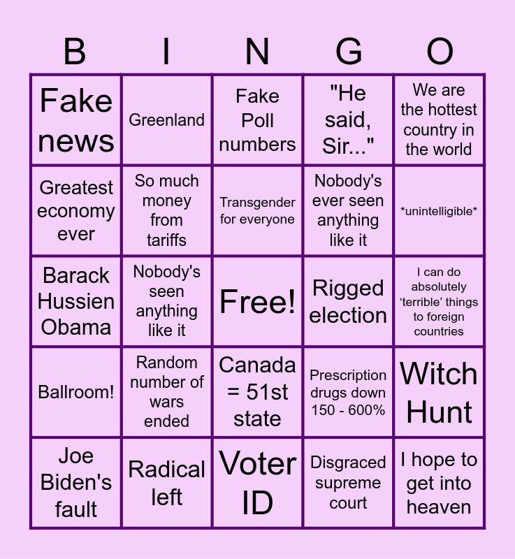 This bingo card has a free space and 24 words: Random number of wars ended, Radical left, Transgender for everyone, Joe Biden's fault, We are the hottest country in the world, Fake news, Greatest economy ever, Greenland, Rigged election, Canada = 51st state, Nobody's ever seen anything like it, Barack Hussien Obama, Prescription drugs down 150 - 600%, Witch Hunt, So much money from tariffs, Disgraced supreme court, I can do absolutely ‘terrible’ things to foreign countries, Fake Poll numbers, *unintelligible*, Nobody's seen anything like it, I hope to get into heaven, Ballroom!, "He said, Sir..." and Voter ID.