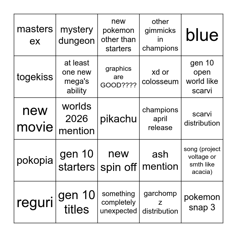 This bingo card has a free space and 24 words: gen 10 starters, gen 10 titles, graphics are GOOD????, reguri, blue, masters ex, togekiss, mystery dungeon, champions april release, new spin off, xd or colosseum, new movie, ash mention, song (project voltage or smth like acacia), at least one new mega's ability, garchomp z distribution, scarvi distribution, new pokemon other than starters, gen 10 open world like scarvi, worlds 2026 mention, pokemon snap 3, pokopia, other gimmicks in champions and something completely unexpected.