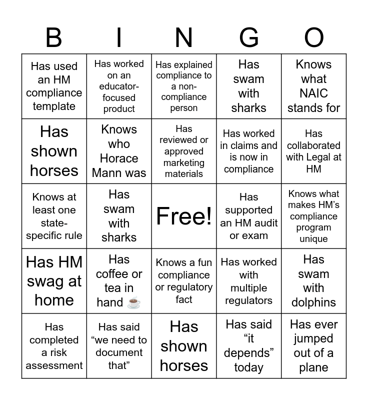 This bingo card has a free space and 34 words: Has worked in compliance 5+ years, Has said “it depends” today, Knows why training documentation matters, Has helped update an HM policy or procedure, Has HM swag at home, Knows who Horace Mann was, Knows what NAIC stands for, Has completed a risk assessment, Has worked on an educator-focused product, Has been at HM < 2 years, Has reviewed or approved marketing materials, Has explained compliance to a non-compliance person, Has responded to a regulatory inquiry, Has built or updated training materials, Has supported an HM audit or exam, Has collaborated with Legal at HM, Has said “we need to document that”, Knows at least one state-specific rule, Has coffee or tea in hand ☕, Has worked with multiple regulators, Knows a fun compliance or regulatory fact, Has participated in controls testing, Has used an HM compliance template, Knows what makes HM’s compliance program unique, Has shown horses, Has ever jumped out of a plane, Has swam with sharks, Has swam with dolphins, Has worked in claims and is now in compliance, Has shown horses, Has ever jumped out of a plane, Has swam with sharks, Has swam with dolphins and Has worked in claims and is now in compliance?.