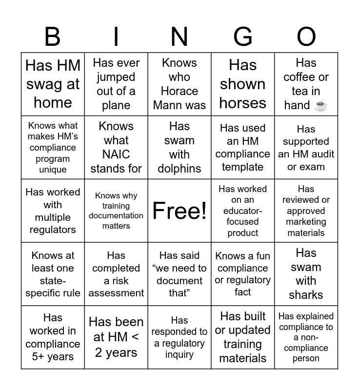 This bingo card has a free space and 29 words: Has worked in compliance 5+ years, Has said “it depends” today, Knows why training documentation matters, Has helped update an HM policy or procedure, Has HM swag at home, Knows who Horace Mann was, Knows what NAIC stands for, Has completed a risk assessment, Has worked on an educator-focused product, Has been at HM < 2 years, Has reviewed or approved marketing materials, Has explained compliance to a non-compliance person, Has responded to a regulatory inquiry, Has built or updated training materials, Has supported an HM audit or exam, Has collaborated with Legal at HM, Has said “we need to document that”, Knows at least one state-specific rule, Has coffee or tea in hand ☕, Has worked with multiple regulators, Knows a fun compliance or regulatory fact, Has participated in controls testing, Has used an HM compliance template, Knows what makes HM’s compliance program unique, Has shown horses, Has ever jumped out of a plane, Has swam with sharks, Has swam with dolphins and Has worked in claims and is now in compliance.