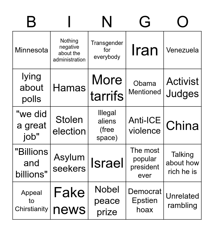 This bingo card has a free space and 30 words: 8 wars, Fake news, Transgender for everybody, Radical left, Venezuela, Minnesota, Hamas, More tarrifs, Obama Mentioned, Unrelated rambling, Appeal to Chirstianity, Asylum seekers, Democrat Epstien hoax, Mispronounces a common word, "Billions and billions", Biden mentioned, Nobel peace prize, Anti-ICE violence, Talking about how rich he is, lying about polls, Stolen election, Hockey team mention, Iran, China, "we did a great job", Nothing negative about the administration, Israel, The most popular president ever, Activist Judges and Stroke face.