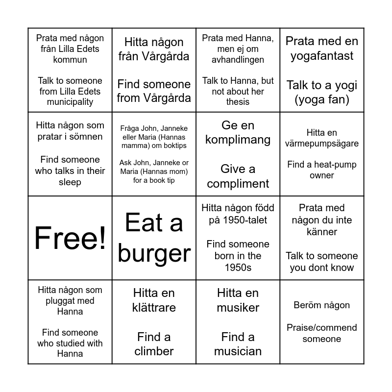 This bingo card has 20 words: Prata med någon du inte känner Talk to someone you dont know, Beställ en rolig drink Order a fun drink, Prata med Hanna, men ej om avhandlingen Talk to Hanna, but not about her thesis, Prata med Björn, men ej om hans avhandling Talk to Björn, but not about his thesis, Hitta någon som pluggat med Hanna Find someone who studied with Hanna, Hitta någon som pratar i sömnen Find someone who talks in their sleep, Hitta en klättrare Find a climber, Prata med någon från Lilla Edets kommun Talk to someone from Lilla Edets municipality, Free!, Hitta någon från Vårgårda Find someone from Vårgårda, Eat a burger, Hitta någon född på 1950-talet Find someone born in the 1950s, Fråga John, Janneke eller Maria (Hannas mamma) om boktips Ask John, Janneke or Maria (Hannas mom) for a book tip, Beröm någon Praise/commend someone, Ge en komplimang Give a compliment, Hälsa på alla Marior Say hello to all the Marias, Hitta en värmepumpsägare Find a heat-pump owner, Prata med en yogafantast Talk to a yogi (yoga fan), Hitta en musiker Find a musician and Skåla med nyblivna doktorn Toast with the new Doctor.