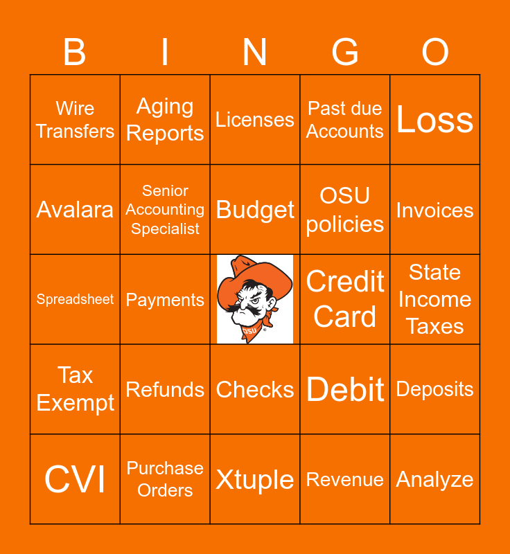 This bingo card has a free space and 38 words: Accounts Receivable, Accounts Payable, Tax Compliance, Senior Accounting Specialist, Deposits, Refunds, Budget, Profit, Loss, OSU policies, Payments, Past due Accounts, Analyze, State Income Taxes, Avalara, Tax Exempt, Sales Tax, Licenses, Cash, Credit Card, Wire Transfers, Purchase Orders, Invoices, CVI, Statements, Xtuple, Reconciliations, P-Card, Banner, OK Corral, Facilities Management, Checks, Revenue, Aging Reports, Credit, Debit, Spreadsheet and NET 30.