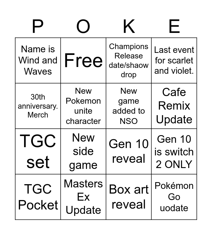 This bingo card has 16 words: Masters Ex Update, Gen 10 is switch 2 ONLY, Champions Release date/shaow drop, Name is Wind and Waves, TGC set, Free, Gen 10 reveal, Box art reveal, 30th anniversary. Merch, New Pokemon unite character, TGC Pocket, Last event for scarlet and violet., New side game, Cafe Remix Update, New game added to NSO and Pokémon Go uodate.