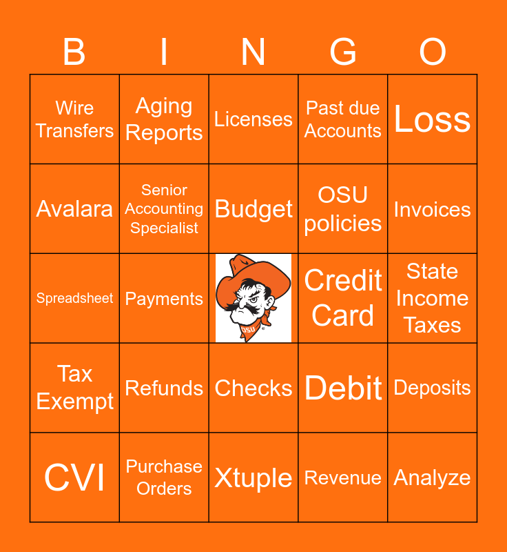 This bingo card has a free space and 38 words: Accounts Receivable, Accounts Payable, Tax Compliance, Senior Accounting Specialist, Deposits, Refunds, Budget, Profit, Loss, OSU policies, Payments, Past due Accounts, Analyze, State Income Taxes, Avalara, Tax Exempt, Sales Tax, Licenses, Cash, Credit Card, Wire Transfers, Purchase Orders, Invoices, CVI, Statements, Xtuple, Reconciliations, P-Card, Banner, OK Corral, Facilities Management, Checks, Revenue, Aging Reports, Credit, Debit, Spreadsheet and NET 30.