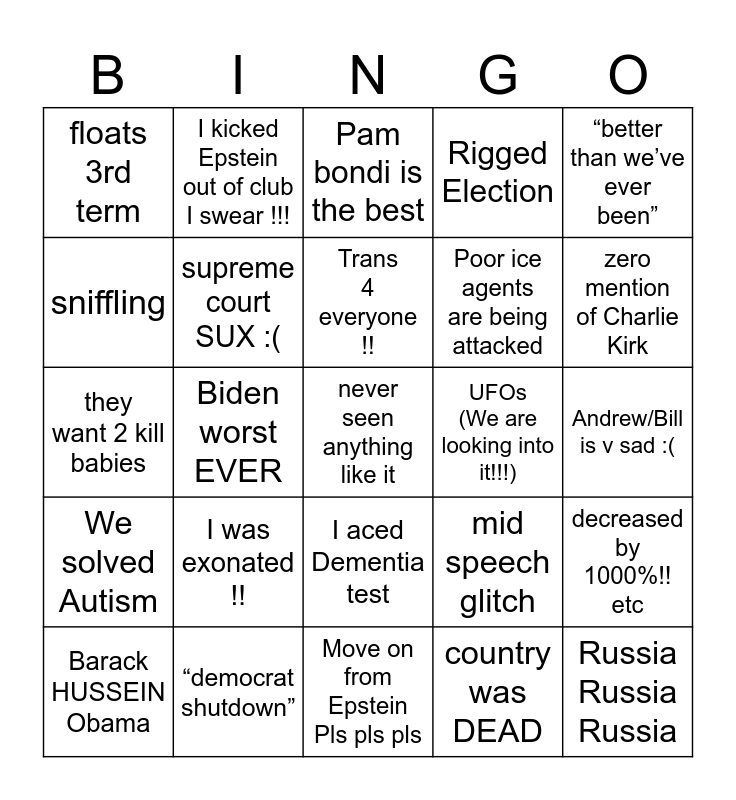 This bingo card has a free space and 24 words: I was exonated !!, “democrat shutdown”, Trans 4 everyone !!, Barack HUSSEIN Obama, “better than we’ve ever been”, floats 3rd term, sniffling, I kicked Epstein out of club I swear !!!, UFOs (We are looking into it!!!), I aced Dementia test, Poor ice agents are being attacked, they want 2 kill babies, mid speech glitch, decreased by 1000%!! etc, supreme court SUX :(, country was DEAD, Andrew/Bill is v sad :(, Pam bondi is the best, zero mention of Charlie Kirk, Biden worst EVER, Russia Russia Russia, We solved Autism, Rigged Election and Move on from Epstein Pls pls pls.