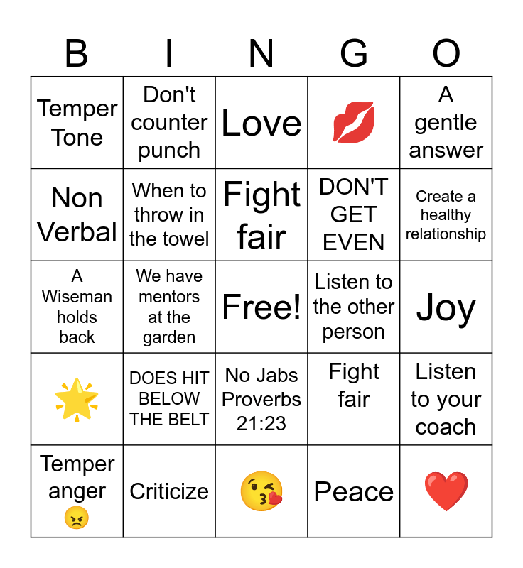 This bingo card has a free space and 24 words: DOES HIT BELOW THE BELT, Criticize, Fight fair, Temper anger 😠, A gentle answer, Temper Tone, Non Verbal, Don't counter punch, Listen to the other person, No Jabs Proverbs 21:23, DON'T GET EVEN, A Wiseman holds back, Fight fair, Listen to your coach, When to throw in the towel, Peace, Joy, Love, Create a healthy relationship, We have mentors at the garden, ❤️, 🌟, 💋 and 😘.