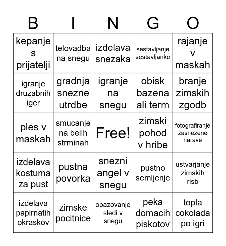 This bingo card has a free space and 30 words: zimske pocitnice, februarsko sankanje, smucanje na belih strminah, drsanje na mestnem drsaliscu, kepanje s prijatelji, izdelava snezaka, gradnja snezne utrdbe, snezni angel v snegu, zimski pohod v hribe, opazovanje sledi v snegu, fotografiranje zasnezene narave, topla cokolada po igri, peka domacih piskotov, kuhanje tople juhe, branje zimskih zgodb, ustvarjanje pustnih mask, pustno semljenje, izdelava kostuma za pust, pustna povorka, rajanje v maskah, ples v maskah, zbiranje idej za kostum, telovadba na snegu, obisk bazena ali term, igranje druzabnih iger, sestavljanje sestavljanke, ustvarjanje zimskih risb, izdelava papirnatih okraskov, igranje na snegu and raziskovanje zimske narave.