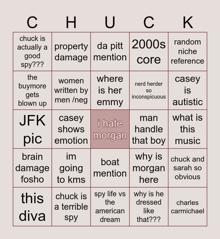 This bingo card has a free space and 39 words: that's his son, bryce larkin mention, bro gets tied up, women written by men /neg, this diva, boat mention, where is her emmy, stay in the car goddamnit, random niche reference, brain damage fosho, casey shows emotion, 2000s core, charles carmichael, what is this music, man handle that boy, im going to kms, "she's so pretty", chuck is actually a good spy???, alcoholism, why is morgan here, the buymore gets blown up, spy life vs the american dream, nerd herder so inconspicuous, casey is autistic, mom and dad are fighting again, "awesome", jeff needs therapy, osmp mention, lester deserves castration, property damage, we need more guns, GAY, da pitt mention, chuck is a terrible spy, why is he dressed like that???, honk heck bangs, chuck and sarah so obvious, JFK pic and this can only end well.