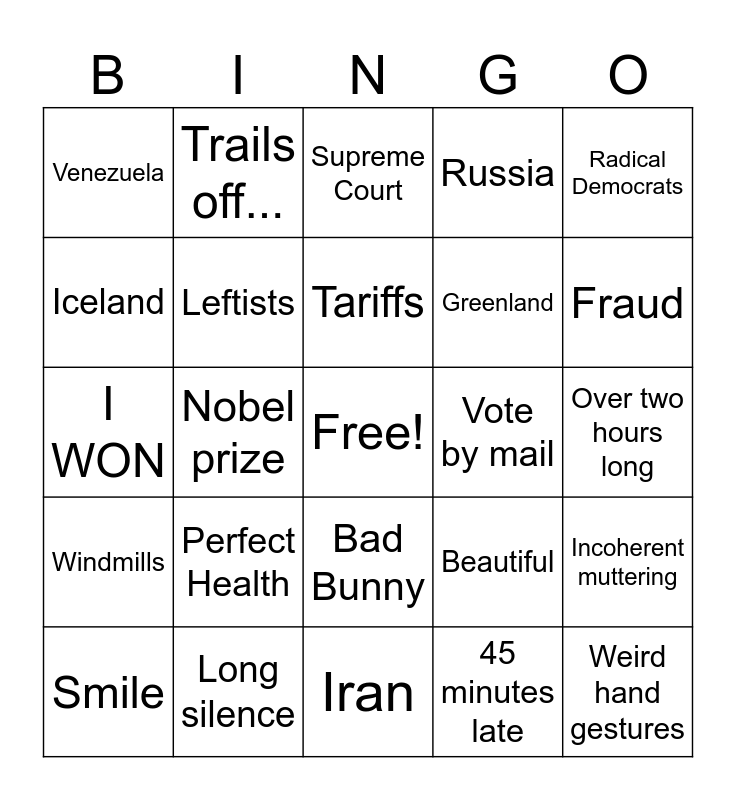 This bingo card has a free space and 32 words: 45 minutes late, 90 minutes long, Nobel prize, Women's Hockey, Windmills, Leftists, Radical Democrats, Incoherent muttering, Trails off..., Olympics, Tariffs, Supreme Court, 2020 Election, Cheating!, Vote by mail, Inappropriate sexual comment, Smile, I WON, Bad Bunny, Perfect Health, Beautiful, 30 minutes late, Over two hours long, Long silence, Weird hand gestures, Russia, Greenland, Iceland, Venezuela, Iran, So much money and Fraud.