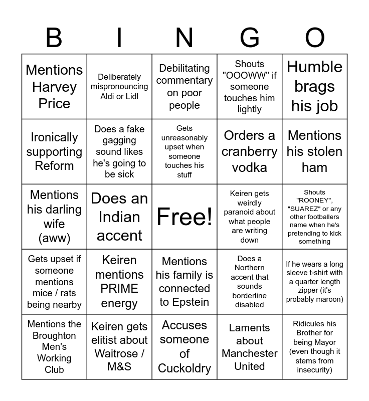 This bingo card has a free space and 24 words: Keiren mentions PRIME energy, Keiren gets elitist about Waitrose / M&S, Gets unreasonably upset when someone touches his stuff, Mentions the Broughton Men's Working Club, Humble brags his job, Mentions Harvey Price, Ironically supporting Reform, Deliberately mispronouncing Aldi or Lidl, Keiren gets weirdly paranoid about what people are writing down, Mentions his family is connected to Epstein, Orders a cranberry vodka, Mentions his darling wife (aww), Does a Northern accent that sounds borderline disabled, If he wears a long sleeve t-shirt with a quarter length zipper (it's probably maroon), Does a fake gagging sound likes he's going to be sick, Laments about Manchester United, Shouts "ROONEY", "SUAREZ" or any other footballers name when he's pretending to kick something, Debilitating commentary on poor people, Mentions his stolen ham, Does an Indian accent, Ridicules his Brother for being Mayor (even though it stems from insecurity), Gets upset if someone mentions mice / rats being nearby, Shouts "OOOWW" if someone touches him lightly and Accuses someone of Cuckoldry.