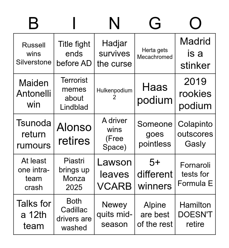 This bingo card has a free space and 24 words: Piastri brings up Monza 2025, Both Cadillac drivers are washed, Hulkenpodium 2, Talks for a 12th team, Madrid is a stinker, Russell wins Silverstone, Maiden Antonelli win, Title fight ends before AD, Someone goes pointless, Lawson leaves VCARB, Haas podium, Tsunoda return rumours, 5+ different winners, Fornaroli tests for Formula E, Terrorist memes about Lindblad, Alpine are best of the rest, Colapinto outscores Gasly, Hadjar survives the curse, 2019 rookies podium, Alonso retires, Hamilton DOESN'T retire, At least one intra-team crash, Herta gets Mecachromed and Newey quits mid-season.