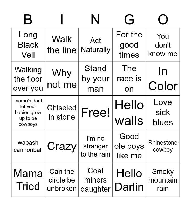 This bingo card has a free space and 24 words: Crazy, Can the circle be unbroken, Stand by your man, Mama Tried, You don't know me, Long Black Veil, Walking the floor over you, Walk the line, Hello walls, I'm no stranger to the rain, The race is on, mama's dont let your babies grow up to be cowboys, Good ole boys like me, Rhinestone cowboy, Why not me, Hello Darlin, Love sick blues, Act Naturally, In Color, Chiseled in stone, Smoky mountain rain, wabash cannonball, For the good times and Coal miners daughter.
