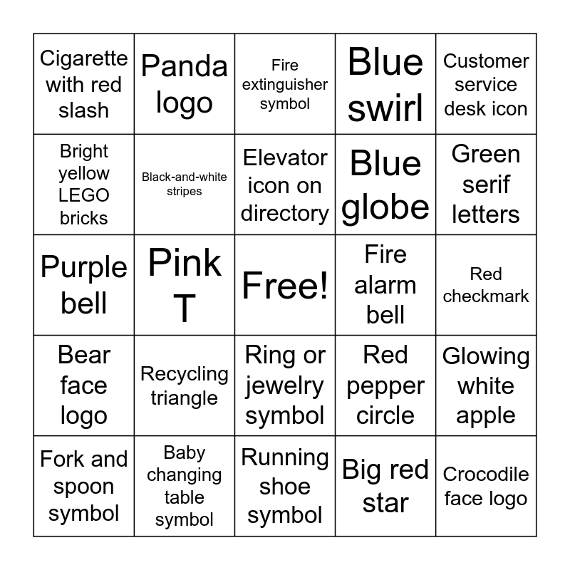 This bingo card has a free space and 60 words: “You Are Here” dot, Baby changing table symbol, Badge or shield, Bear face logo, Big red star, Big S logo, Black‑and‑white stripes, Blue eagle logo, Blue globe, Blue oval sign, Blue swirl, Blue‑and‑white checkered pattern, Bright yellow LEGO bricks, Bus icon, Charging station lightning bolt, Cigarette with red slash, Crocodile face logo, Customer service desk icon, Diamond ring imagery, Elevator icon on directory, Fire alarm bell, Fire extinguisher symbol, Fork and spoon symbol, Glowing white apple, Gold candle logo, Graffiti‑style logo, Green burger icon, Green EXIT sign, Green serif letters, Green sporting goods sign, Male and female stick figures, Mall entrance icons, Moose logo, Orange graffiti letters, Panda logo, Person on moving stairs, Phone handset symbol, Pink T, Pretzel symbol, Purple bell, Question mark symbol, Recycling triangle, Red checkmark, Red omega symbol, Red pepper circle, Red script, Red star on the map, Restaurant area on map, Restroom icon on directory, Ring or jewelry symbol, Running shoe symbol, Script letters with bird imagery, Skateboard‑style V, Stairs icon, Stroller parking symbol, Sunglasses icon, Teal script letters, Up and down arrows, Walking person in yellow diamond and Wheelchair accessibility symbol.