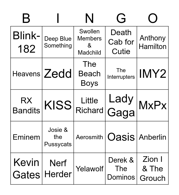 This bingo card has 40 words: The 311, RX Bandits, R.B. Greaves, Zedd, Nerf Herder, Aerosmith, The Beach Boys, Lil Wayne, Anthony Hamilton, Eminem, KISS, Death Cab for Cutie, Little Richard, MxPx, Lady Gaga, Josie & the Pussycats, The Police, Blink-182, The Kinks, Swollen Members & Madchild, Anberlin, Derek & The Dominos, The Interrupters, Heavens, Snak the Ripper, Less Than Jake, Shaggy, Elvis Presley, Zion I & The Grouch, Weezer, Red Hot Chili Peppers, Kevin Gates, Dynamite Boy, Oasis, IMY2, Yelawolf, Joe Diffie, Gym Class Heroes, Deep Blue Something and Chiiret J.