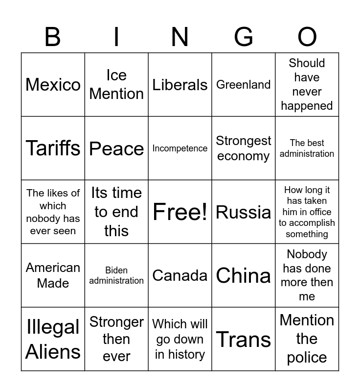 This bingo card has a free space and 24 words: Biden administration, Stronger then ever, Incompetence, Illegal Aliens, Should have never happened, Mexico, Tariffs, Ice Mention, Russia, Canada, Strongest economy, The likes of which nobody has ever seen, China, Nobody has done more then me, Peace, Trans, How long it has taken him in office to accomplish something, Liberals, The best administration, Its time to end this, Mention the police, American Made, Greenland and Which will go down in history.