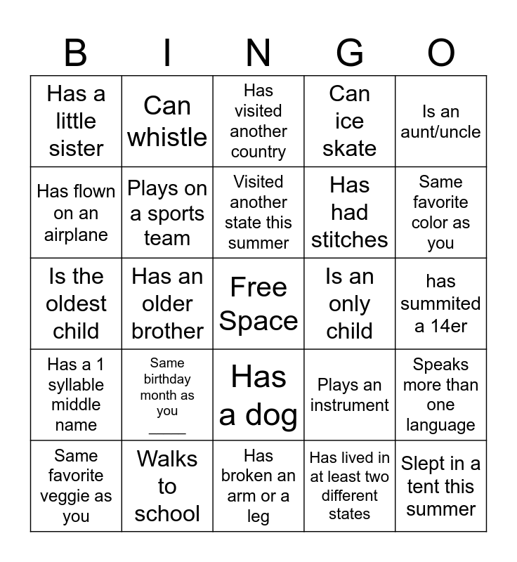 This bingo card has a free space and 24 words: Same birthday month as you _____, Walks to school, Visited another state this summer, Same favorite veggie as you, Is an aunt/uncle, Has a little sister, Has flown on an airplane, Can whistle, Is an only child, Has a dog, Has had stitches, Is the oldest child, Plays an instrument, Speaks more than one language, Plays on a sports team, Has lived in at least two different states, has summited a 14er, Has visited another country, Same favorite color as you, Has an older brother, Slept in a tent this summer, Has a 1 syllable middle name, Can ice skate and Has broken an arm or a leg.