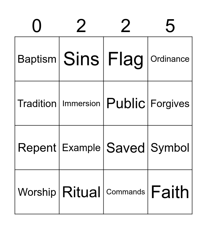 This bingo card has 16 words: Ritual, Symbol, Flag, Baptism, Repent, Sins, Saved, Commands, Tradition, Immersion, Worship, Ordinance, Example, Forgives, Public and Faith.