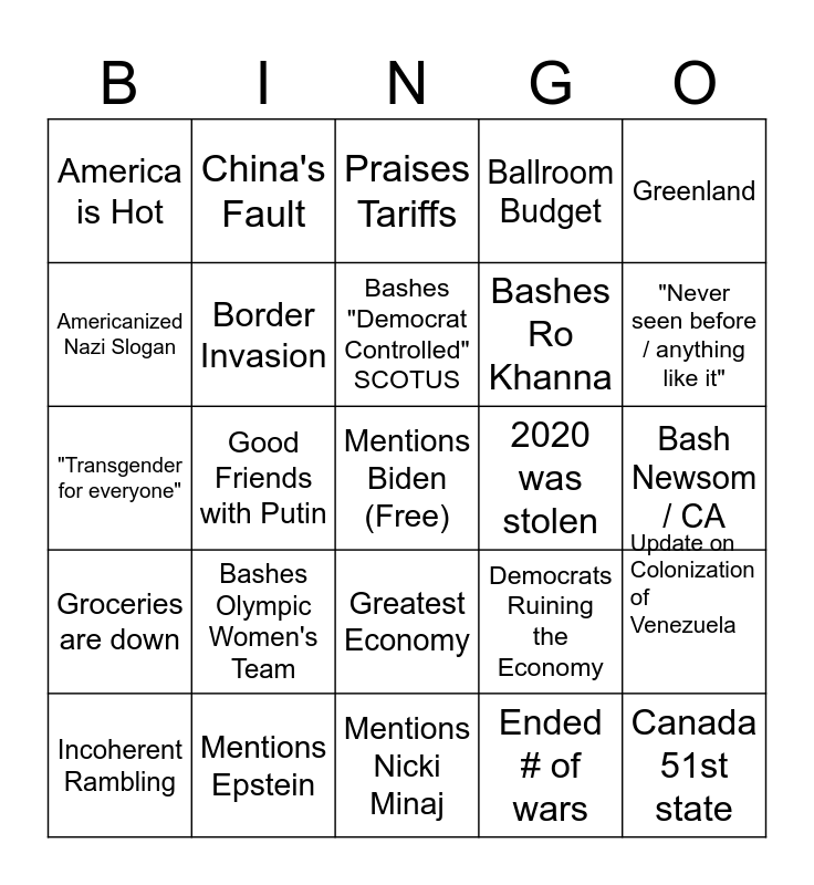 This bingo card has a free space and 34 words: Pushing War with Iran, Ended # of wars, Forgets the name of topic he brought up, DOW 50k, Groceries are down, Border Invasion, Greenland, Incoherent Rambling, China's Fault, Poll Numbers are Fake, Bashes "Democrat Controlled" SCOTUS, Praises Tariffs, Praises Israel, Mentions Obama, 2020 was stolen, "Never seen before / anything like it", Mentions Epstein, "Transgender for everyone", Bashes Olympic Women's Team, Democrats Ruining the Economy, Greatest Economy, Prescriptions down by >100%, America is Hot, Bash Newsom / CA, Mentions Nicki Minaj, Canada 51st state, Ballroom Budget, Bashes Thomas Massie, Bashes Ro Khanna, Americanized Nazi Slogan, "Democrat Party", Good Friends with Putin, Update on Colonization of Venezuela and "Many are saying...".