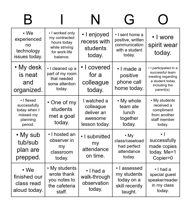 This bingo card has 51 words: Free!, I watched a colleague deliver an awesome lesson today., • I had my formal observation today., • I had a walk-through observation today., • I hosted an observer in my classroom today., • I arrived early today and feel super organized., • I worked only my contracted hours today while striving for work-life balance., • I stayed late yesterday to get organized and feel “on top of it” today!, • My desk is neat and organized., • I tucked a pair of slippers under my desk in case of sore feet!, • I cleaned up a part of my room that needed some attention today., • I sent home a positive, written communication with a student today., • I successfully made copies today. Me=1 Copier=0, • My class/caseload had perfect attendance today., • I have zero unread emails in my inbox., • I responded to an email from a parent., • I covered for a colleague today., • My whole team ate lunch together today., • My lesson plans are completed for the entire week!, • I wore spirit wear today., • One of my students met a goal today., • I assessed my students today on a skill recently taught., • We experienced no technology issues today., • I made a positive phone call home today., • My students earned a whole class reward today., • I had a special guest speaker/reader in my class today., • I participated in a successful team meeting regarding a student today including the parent(s)., • My class did zero worksheets today., • We finished our class read aloud today., • I enjoyed recess with students today., • I decorated the classroom door today., • I put up a new bulletin board today., • I changed the hallway display., • I heard from a former student today., • I made copies for my whole team today., • My students wrote thank you notes to the cafeteria staff., • My students wrote thank you notes to the custodial staff., • My students wrote notes to their favorite specials area teacher., • My students wrote notes to their bus drivers today., • I left a treat for my substitute teacher., • My students received a compliment from another staff member today., • My sub tub/sub plan are prepped., • I received a complimentary note from my stub., • I presented to my colleagues at our staff meeting., • I participated in a district committee meeting today., • I shared a new resource with a colleague., • I flexed successfully today when I missed my planning period., • I incorporated music in my classroom today., • I brought doughnuts for my team., • I submitted my attendance on time. and • I had a parent volunteer in my classroom today..