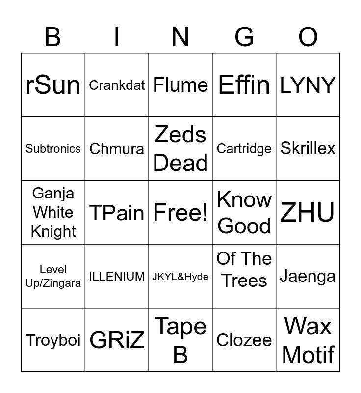 This bingo card has a free space and 24 words: ILLENIUM, GRiZ, Zeds Dead, Troyboi, LYNY, rSun, Subtronics, Crankdat, Know Good, JKYL&Hyde, Cartridge, Ganja White Knight, Of The Trees, Jaenga, Chmura, Clozee, ZHU, Flume, Skrillex, TPain, Wax Motif, Level Up/Zingara, Effin and Tape B.