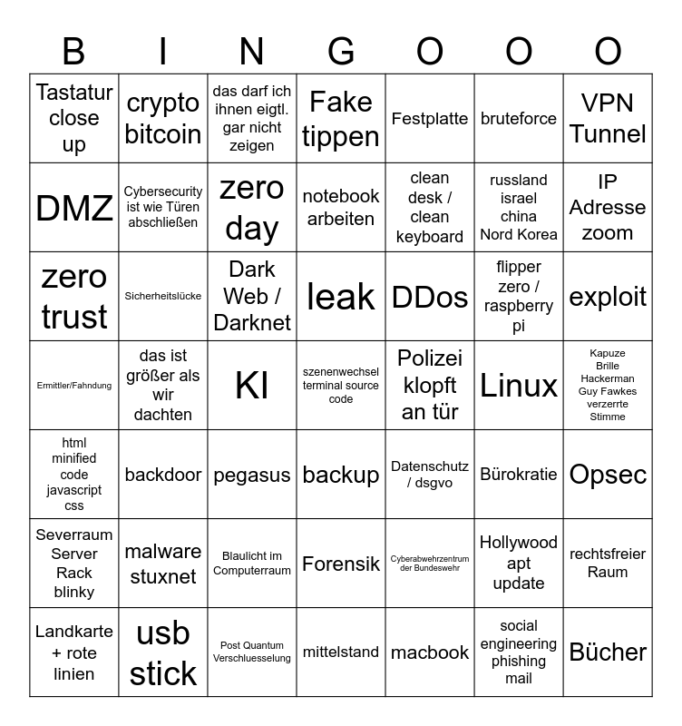 This bingo card has 49 words: Hollywood apt update, russland israel china Nord Korea, macbook, das ist größer als wir dachten, Dark Web / Darknet, Kapuze Brille Hackerman Guy Fawkes verzerrte Stimme, crypto bitcoin, Post Quantum Verschluesselung, bruteforce, backup, VPN Tunnel, Fake tippen, flipper zero / raspberry pi, DDos, malware stuxnet, Linux, DMZ, IP Adresse zoom, rechtsfreier Raum, Festplatte, clean desk / clean keyboard, KI, Tastatur close up, Cybersecurity ist wie Türen abschließen, Landkarte + rote linien, zero day, exploit, usb stick, leak, Sicherheitslücke, Bücher, Polizei klopft an tür, Severraum Server Rack blinky, Blaulicht im Computerraum, Ermittler/Fahndung, Datenschutz / dsgvo, Bürokratie, Opsec, zero trust, pegasus, Forensik, html minified code javascript css, szenenwechsel terminal source code, mittelstand, notebook arbeiten, das darf ich ihnen eigtl. gar nicht zeigen, Cyberabwehrzentrum der Bundeswehr, backdoor and social engineering phishing mail.