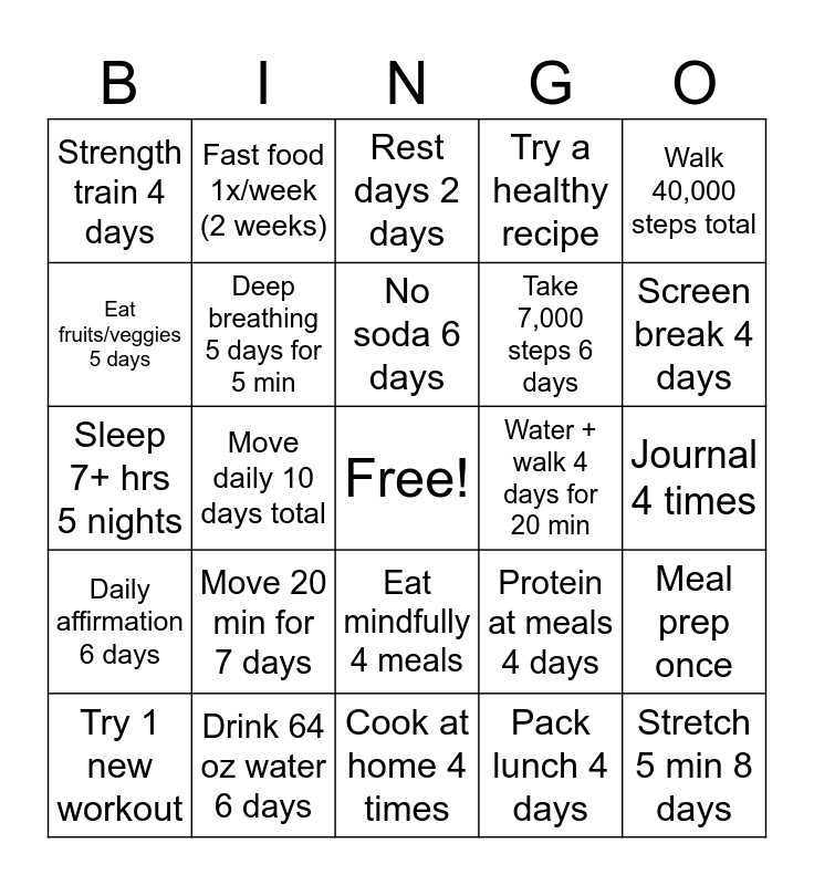 This bingo card has a free space and 24 words: Move 20 min for 7 days, Drink 64 oz water 6 days, No soda 6 days, Try 1 new workout, Walk 40,000 steps total, Strength train 4 days, Eat fruits/veggies 5 days, Fast food 1x/week (2 weeks), Water + walk 4 days for 20 min, Eat mindfully 4 meals, Take 7,000 steps 6 days, Sleep 7+ hrs 5 nights, Protein at meals 4 days, Meal prep once, Deep breathing 5 days for 5 min, Pack lunch 4 days, Journal 4 times, Rest days 2 days, Screen break 4 days, Move daily 10 days total, Stretch 5 min 8 days, Daily affirmation 6 days, Try a healthy recipe and Cook at home 4 times.