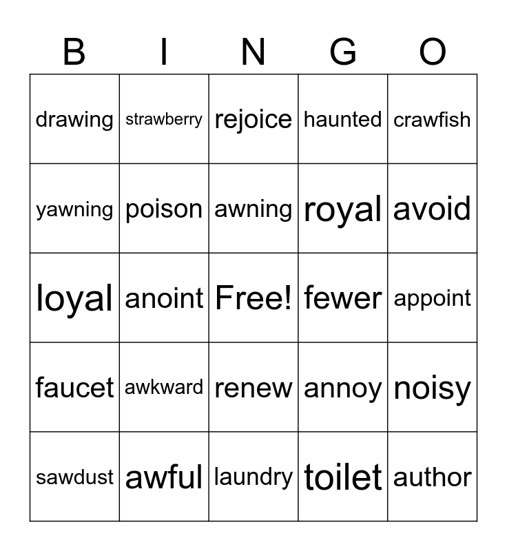 This bingo card has a free space and 24 words: awkward, awful, awning, sawdust, crawfish, drawing, yawning, strawberry, fewer, renew, royal, loyal, annoy, noisy, poison, toilet, appoint, rejoice, avoid, anoint, author, faucet, haunted and laundry.