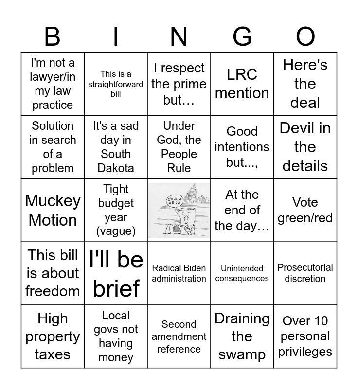 This bingo card has a free space and 54 words: Protecting children, This bill is about freedom, Traditional South Dakota values, Unfunded mandate, Radical Biden administration, No eminent domain for private gain, LRC mention, Tool in the toolbox, Solution in search of a problem, This is a simple cleanup bill, I'm not a lawyer/in my law practice, They sing a song, Local govs not having money, High property taxes, Second floor, Second amendment reference, Over 10 personal privileges, Good intentions but...,, I respectfully defer my time to the bill's prime sponsor, Vote green/red, Unintended consequences, Slippery slope, At the end of the day…, Here's the deal, Having teeth, This is a straightforward bill, Leveling the playing field, Already on the books/this bill is unnecessary, Open for business, Draining the swamp, Republican platform, Hyperscale data center, Point of order, Uses AI/admits to using AI, I respect the prime but…, Senate tie vote w/ TV vote, Muckey Motion, Prosecutorial discretion, Free-est state in the nation, It's a sad day in South Dakota, Taxpayer money, Keep our eyes on the ball, Local control, I wasn't planning on speaking today, I'll be brief, Not ready for primetime, Strawman argument, Founding Fathers, Under God, the People Rule, Tight budget year (vague), Devil in the details, Kicking the can down the road, Sausage making and We the People.