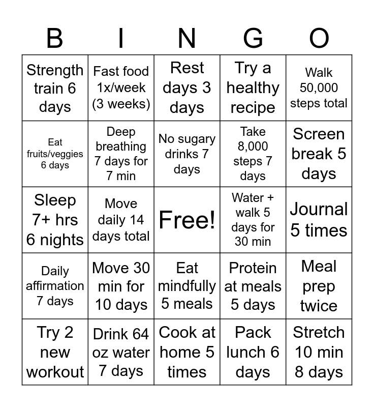 This bingo card has a free space and 24 words: Move 30 min for 10 days, Drink 64 oz water 7 days, No sugary drinks 7 days, Try 2 new workout, Walk 50,000 steps total, Strength train 6 days, Eat fruits/veggies 6 days, Fast food 1x/week (3 weeks), Water + walk 5 days for 30 min, Eat mindfully 5 meals, Take 8,000 steps 7 days, Sleep 7+ hrs 6 nights, Protein at meals 5 days, Meal prep twice, Deep breathing 7 days for 7 min, Pack lunch 6 days, Journal 5 times, Rest days 3 days, Screen break 5 days, Move daily 14 days total, Stretch 10 min 8 days, Daily affirmation 7 days, Try a healthy recipe and Cook at home 5 times.