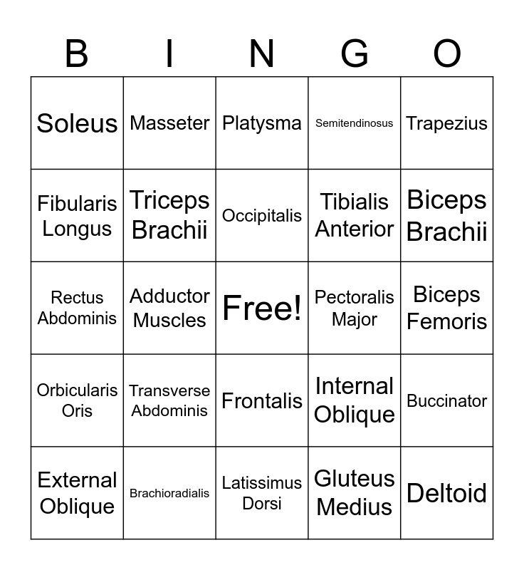 This bingo card has a free space and 33 words: Vastus Lateralis, Rectus Femoris, Adductor Muscles, Sartorius, Orbicularis Oris, Triceps Brachii, Trapezius, External Oblique, Masseter, Temporalis, Occipitalis, Platysma, Sternocleidomastoid, Semimembranosus, Pectoralis Major, Biceps Brachii, Brachioradialis, Rectus Abdominis, Transverse Abdominis, Internal Oblique, Frontalis, Zygomaticus, Soleus, Biceps Femoris, Latissimus Dorsi, Deltoid, Semitendinosus, Tibialis Anterior, Fibularis Longus, Buccinator, Gluteus Maximus, Gluteus Medius and Vastus Medialis.