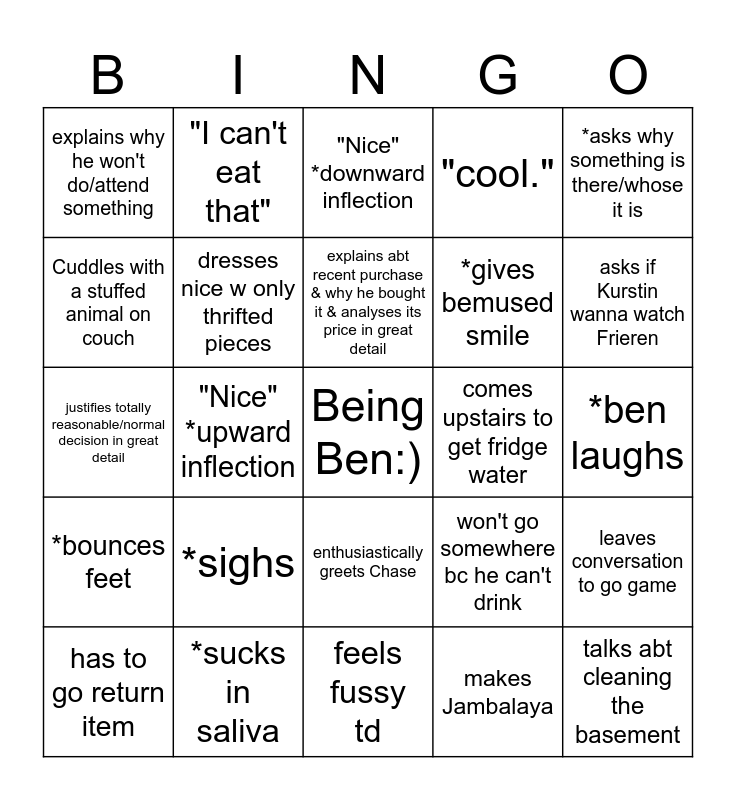 This bingo card has a free space and 24 words: *sighs, *sucks in saliva, explains abt recent purchase & why he bought it & analyses its price in great detail, has to go return item, *asks why something is there/whose it is, explains why he won't do/attend something, Cuddles with a stuffed animal on couch, "I can't eat that", comes upstairs to get fridge water, enthusiastically greets Chase, *gives bemused smile, justifies totally reasonable/normal decision in great detail, won't go somewhere bc he can't drink, leaves conversation to go game, dresses nice w only thrifted pieces, makes Jambalaya, *ben laughs, "Nice" *downward inflection, asks if Kurstin wanna watch Frieren, "Nice" *upward inflection, talks abt cleaning the basement, *bounces feet, "cool." and feels fussy td.