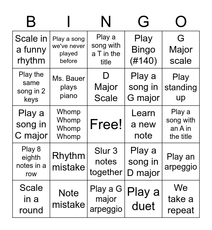 This bingo card has a free space and 24 words: Rhythm mistake, Note mistake, D Major Scale, Scale in a round, G Major scale, Scale in a funny rhythm, Play the same song in 2 keys, Play a song we've never played before, Learn a new note, Slur 3 notes together, Play a song in G major, Play a song in C major, Play a song in D major, Play an arpeggio, Ms. Bauer plays piano, Play a duet, Play a song with an A in the title, Play a song with a T in the title, Play standing up, Whomp Whomp Whomp Whomp, We take a repeat, Play 8 eighth notes in a row, Play Bingo (#140) and Play a G major arpeggio.