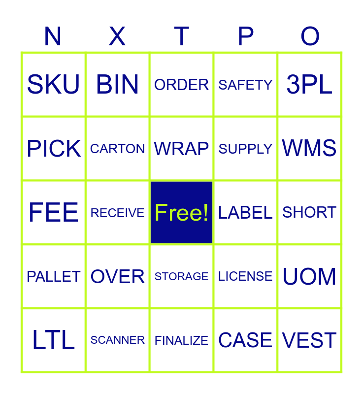 This bingo card has a free space and 60 words: WHSE, SCANNER, FORKLIFT, PALLET, CASE, EACH, CARTON, RACK, SUPPLY, CHAIN, SAFETY, PULL, PICK, PACK, SHIP, SKU, VEST, 3PL, CLIENT, WRAP, LABEL, ORDER, LTL, UOM, DESTACK, KITTING, BOL, ITEM, WMS, EDI, CYCLE, COUNT, PO, LP, BIN, LOCATION, INVOICE, RECEIVE, CHARGE, FEE, CONTRACT, OVER, SHORT, DAMAGE, LICENSE, PLATE, PURCHASE, FULFILL, UNIT, STORAGE, FINALIZE, AGILITY, TEAMWORK, TRUST, INNOVATION, CARE, FISHBOWL, GRATITUDE, EMPLOYEE and APPRECIATE.